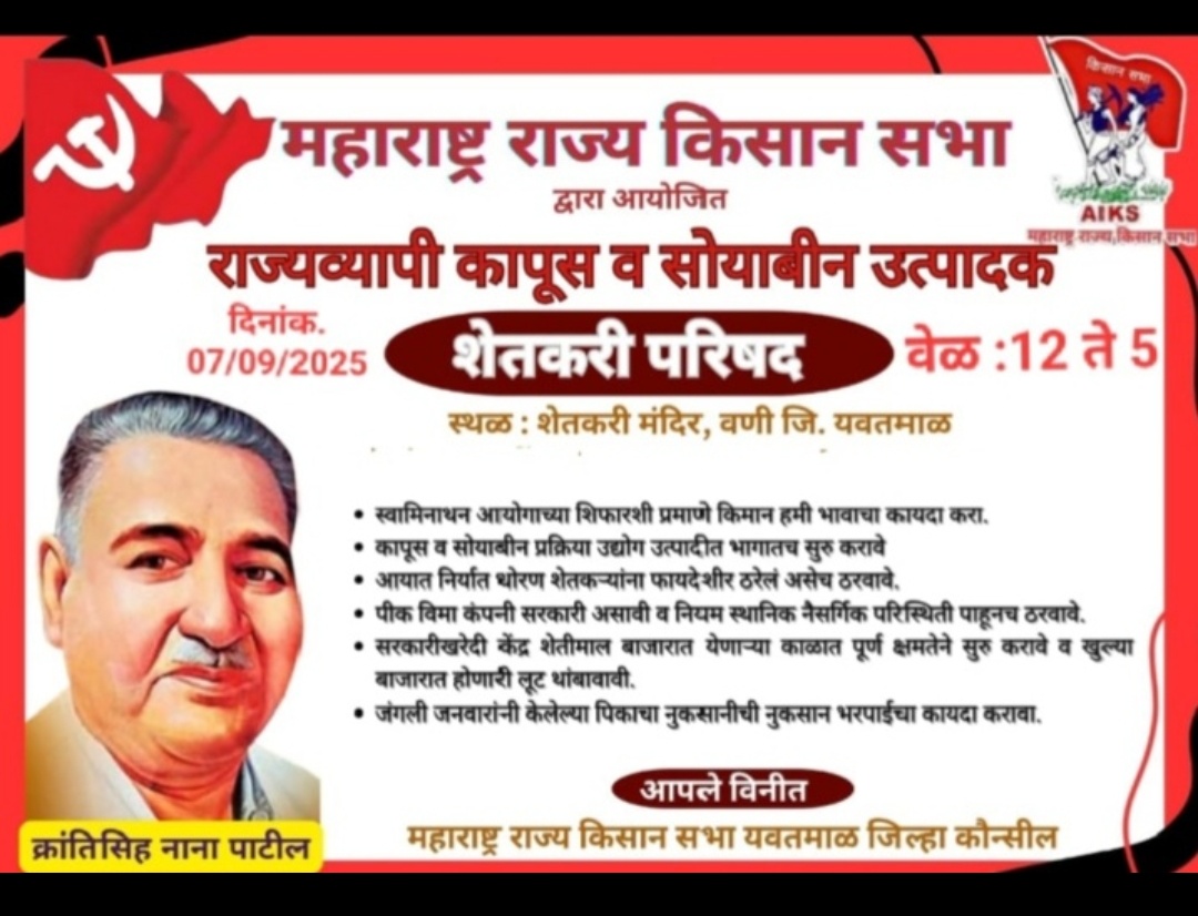 वणी — महाराष्ट्र राज्य किसान सभेच्या वतीने वणी येथे 7 सप्टें. ला दु.12 वाजता शेतकरी मंदीर येथे राज्यव्यापी कापूस व सोयाबीन उत्पादक शेतकरी परिषदेचे आयोजन करण्यात आले आहे. परीषदेला मार्गदर्शक म्हणुन किसान सभेचे राष्ट्रीय अध्यक्ष काॅ.राजन क्षिरसागर (परभणी), प्रसिद्ध अर्तज्ञथ डाॅ.श्रिनीवास खांदेवाले(नागपूर),शेतकरी नेते काॅ.तुकाराम भस्मे(अमरावती), राज्याध्यक्ष अॅड.हिरालाल परदेशी (धुळे), राज्यसचिव काॅ.अशोक साेनारकर(अमरावती) आणि अन्य मान्यवर उपस्थित राहणार आहे. परिषदेसाठी सर्व शेतकऱ्यांना क्रांतीसिंह नाना पाटील यांच्या लढाऊ परंपरेने एकत्र येण्याचे आवाहन करण्यात येत आहे.