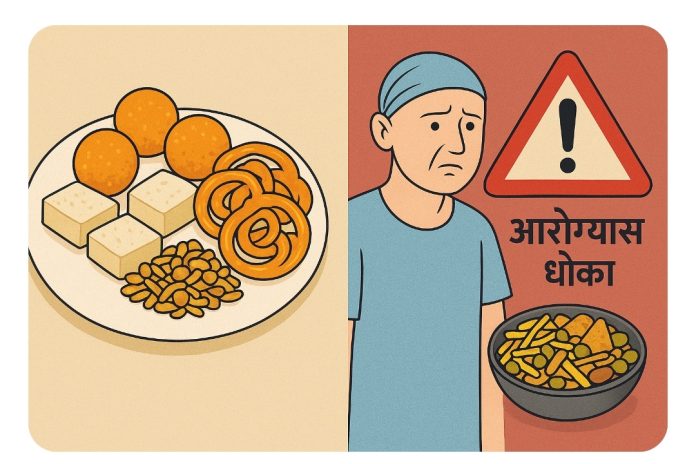 फरसाण, चकली, शंकरपाळे तयार करताना वारंवार वापरलेले तेल वापरले जाते. हे तेल ‘ट्रान्स-फॅट’ वाढवते आणि हृदयविकार निर्माण करते. शिवाय काही ठिकाणी अॅल्युमिनियमयुक्त बेकिंग पावडर वापरली जाते, जी पचनसंस्थेवर ताण आणते.
