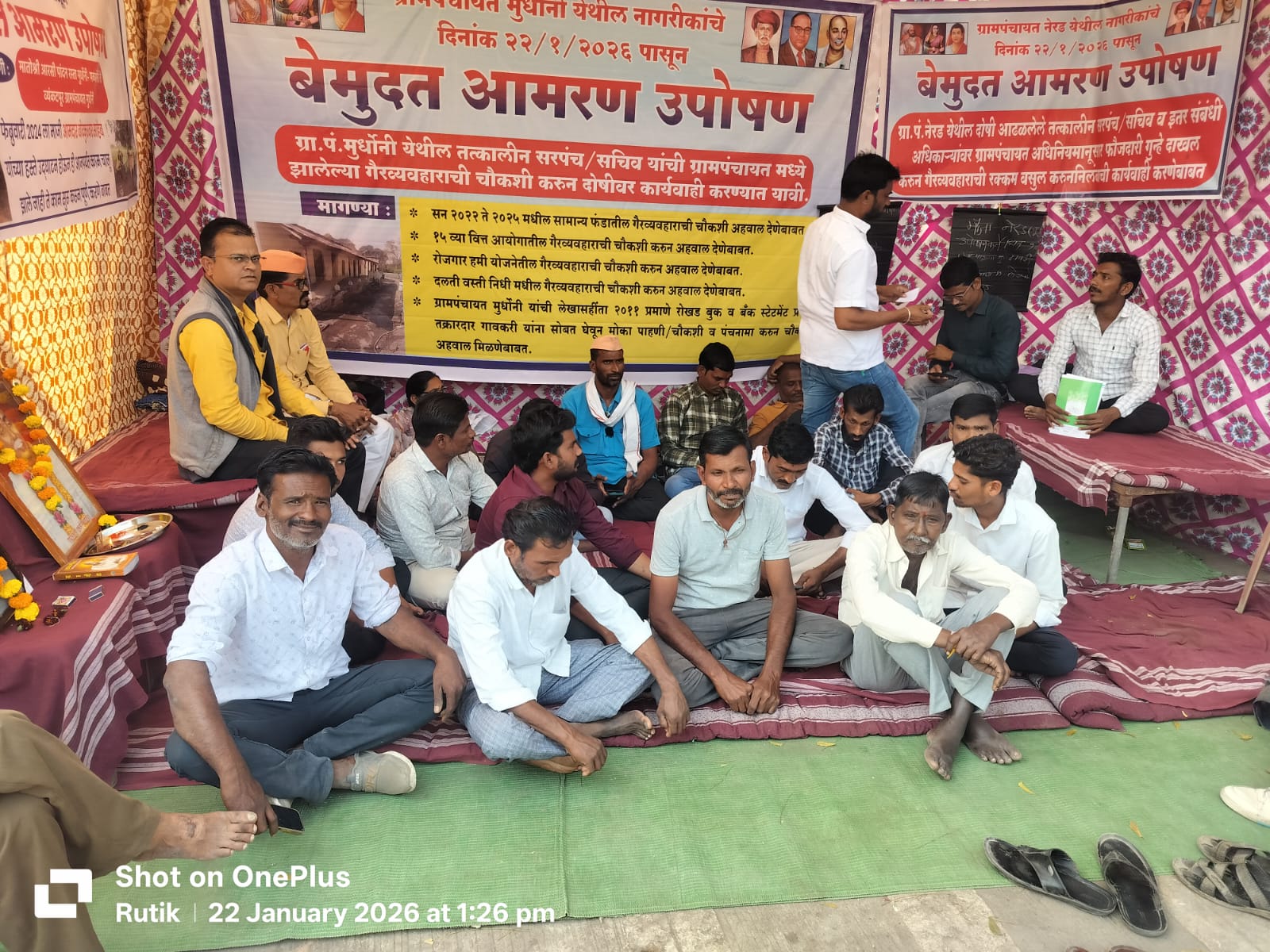 वणी :- ग्रामपंचायत मुर्धोनी व नेरड येथील कथित आर्थिक गैरव्यवहार, भ्रष्टाचार तसेच दोषींवर कारवाई न झाल्याच्या निषेधार्थ २२ जानेवारी २०२६ रोजी दुपारी १ वाजतापासून वणी येथील तहसील कार्यालयासमोर दोन्ही गावांतील नागरिकांनी एकाच मंडपात बेमुदत आमरण उपोषण आंदोलन सुरू केले आहे. दोन्ही गावांच्या मागण्या स्वतंत्र असल्या तरी प्रशासनाच्या उदासीन भूमिकेविरोधात हे आंदोलन एकत्रित स्वरूपात छेडण्यात आले आहे.